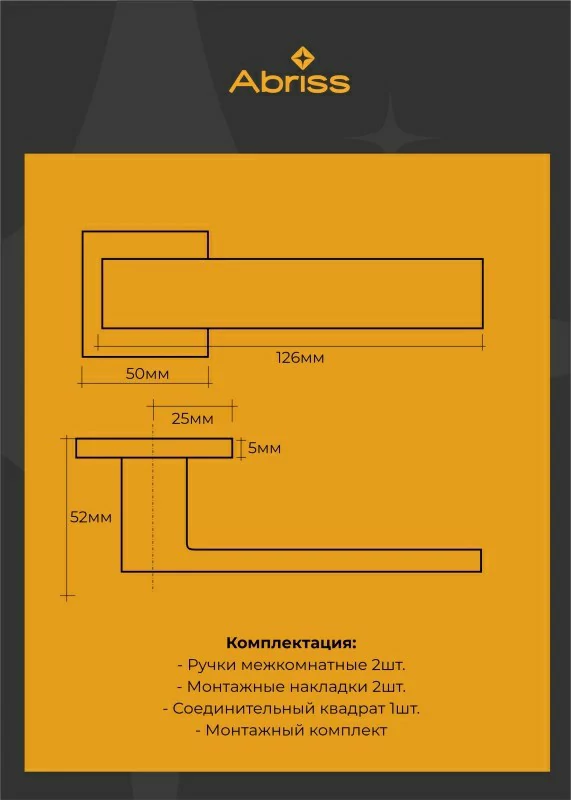 Комплект: две ручки на одно дверное полотно, монтажный комплект, соединительный квадрат (8мм*8мм*110 мм).