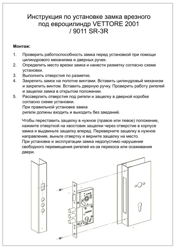 Замок врезной под евроцилиндр VЕTTORE 9011 SR-3R AB.